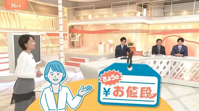 このスタジオで、最新ニュースから生活情報まで、3時間超えの長丁場です。そして出水さんのコーナー、「きょうの値段」の時間がやってきました。CM中に移動する出水さんの、軽快な挨拶が聞こえてきます。