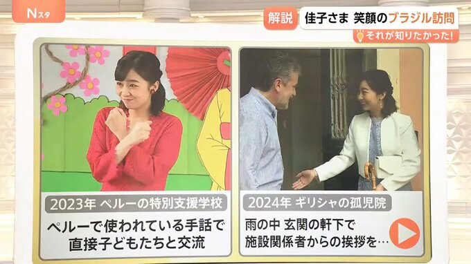 2023年、ペルーの特別支援学校に行かれたときに、耳の不自由な子どもたちと交流しました。その際は、「ペルーで使われている手話で、直接子どもたちと交流したい」と佳子さまが思われて、現地の学校から教材などを送っていただき、それを見て勉強されて、直接交流されました。