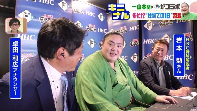 「放送席にスペシャルゲスト、岩内町出身一山本関にお越しいただきました、ファーストピッチもあ疲れ様でした」