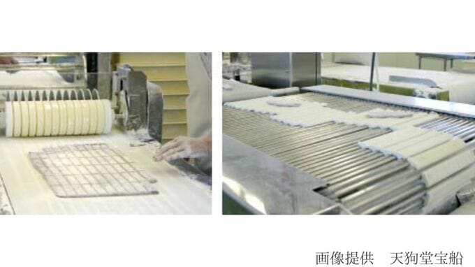 「次に、餅をローラーで伸ばし縦横に切れ目を入れます。手作業で4辺の半端な部分をおおまかに取り除きます」【画像⑤】
