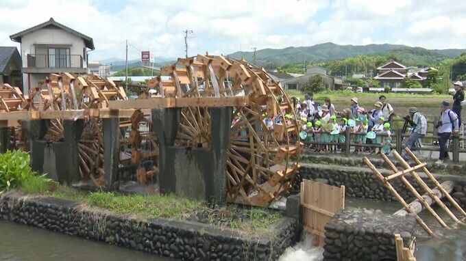 田植えの時期を迎えた福岡県朝倉市で日本最古の水車とされる「三連水車」が今年も動き始めました。