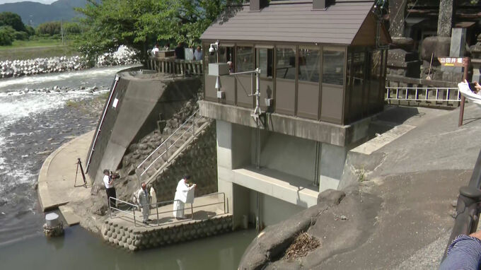 朝倉市で17日、山田堰(やまだぜき)の通水式が開かれ豊作を祈願する神事が行われた後水門が開かれました。