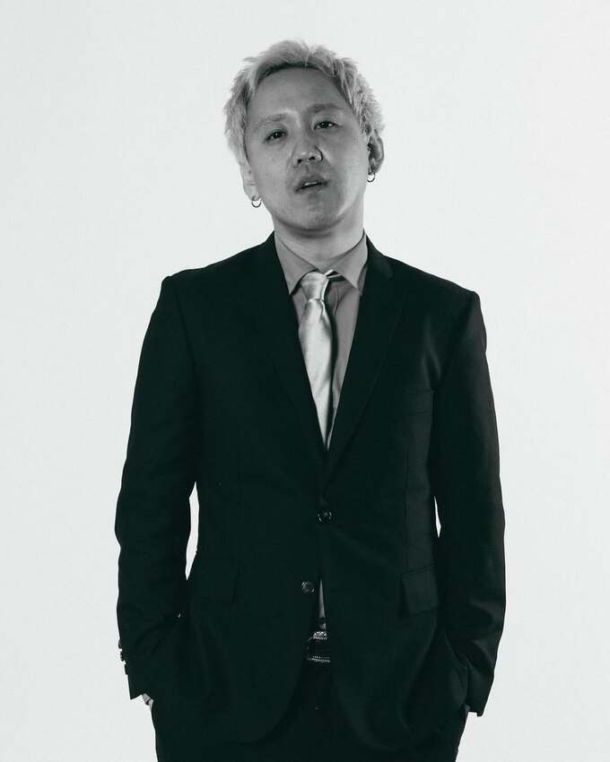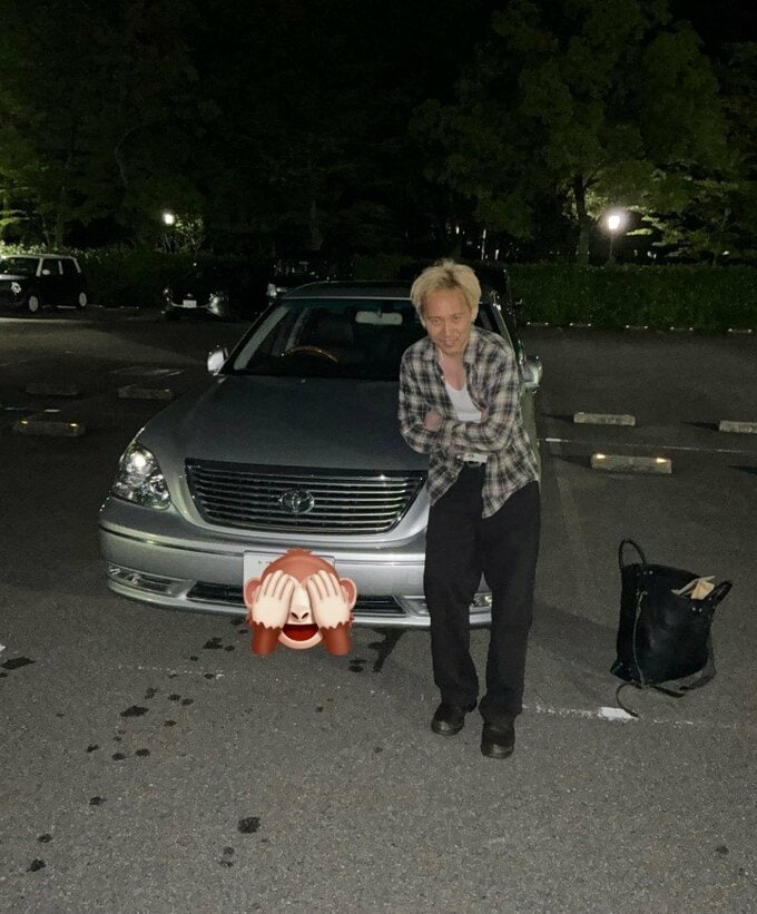 てらうちさんは、金髪の生え際が黒くなってしまっている “プリン” 状態で、チェックのシャツに黒パンツというオフ目なスタイルで夜の駐車場でにやりと微笑みつつ2ショット。その相手は、銀色に鈍く輝く堂々たるセダン車です。
