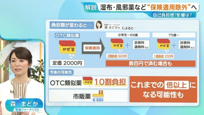 仮に定価2000円の風邪薬(OTC類似薬)の場合、現段階では保険が適用され、小学生〜69歳は3割負担で600円。これに診察料や調剤料などが加わります。
