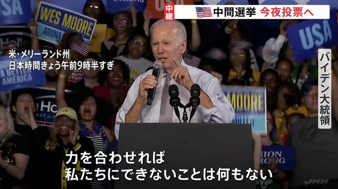 アメリカの政治の行方を左右する中間選挙の投票が日本時間の今夜から始まります。バイデン大統領は先ほど、最後の訴えを行いました。ワシントン支局から中継です。バイデン大統領が最後の演説の会場に選んだのは、…