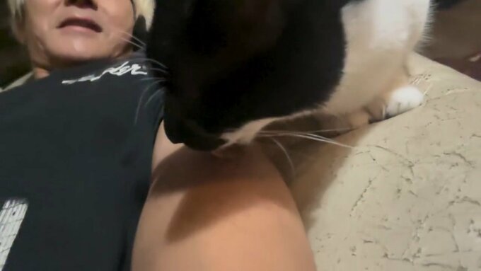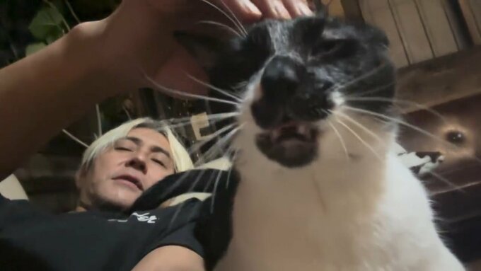 ヒロシさんが「あっちゃん、そんな狭いとこ来てどうすんのあんた」と呼びかけると、 “あっちゃん” はヒロシさんの腕をぺろぺろとなめ始めます。それに答えてヒロシさんが「きゃわきゃわ♪」とメロディを口ずさむと、 “あっちゃん” は香箱を組んで、ヒロシさんのそばで落ち着きます。