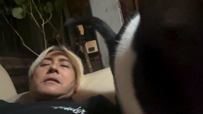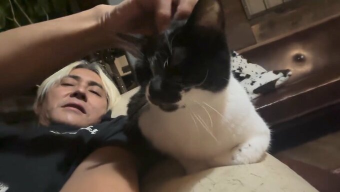 ヒロシさんは「わざわざ、クソ狭い場所に来るあっちゃん。」とテキスト。投稿した動画では、顔は黒・身体は白の猫「あっちゃん」が、ヒロシさんがくつろぐソファの狭い座面に上ってきて、ヒロシさんに寄り添っています。