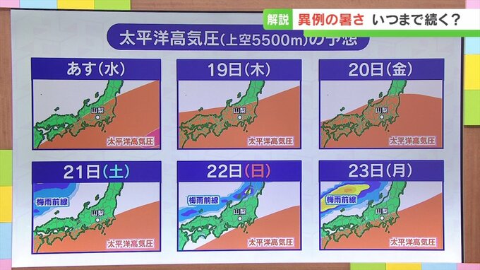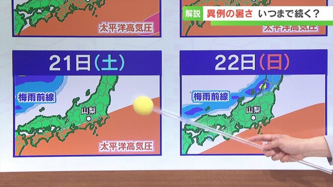 甲府38.2℃ 全国一の暑さ なぜ暑いのか いつまで続くのか、米津龍一気象予報士が解説 テレビ山梨 2025年6月17日(火) 19:04 国内 天気 金曜日も、かかってますよね。 土曜日、ようやく南下がってますが、ほとんど、これもうきわきわの状況です。 日曜日ちょっと南に南下していますが、来週の月曜日から、またこれ北へと上がってくる。 梅雨前線も山梨から離れている形となっています。