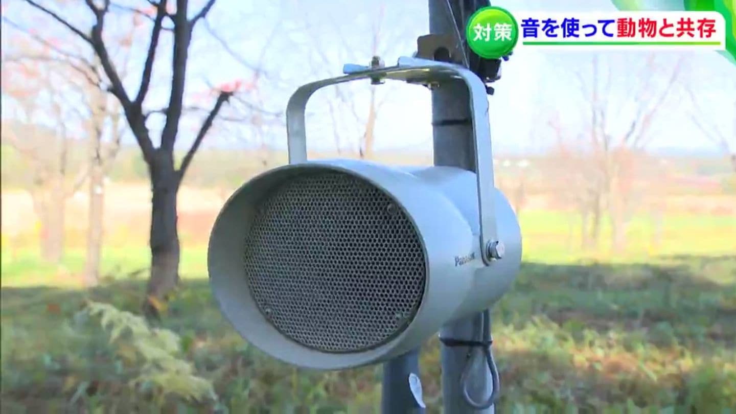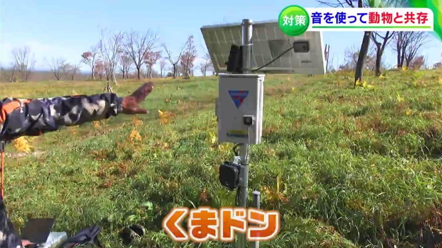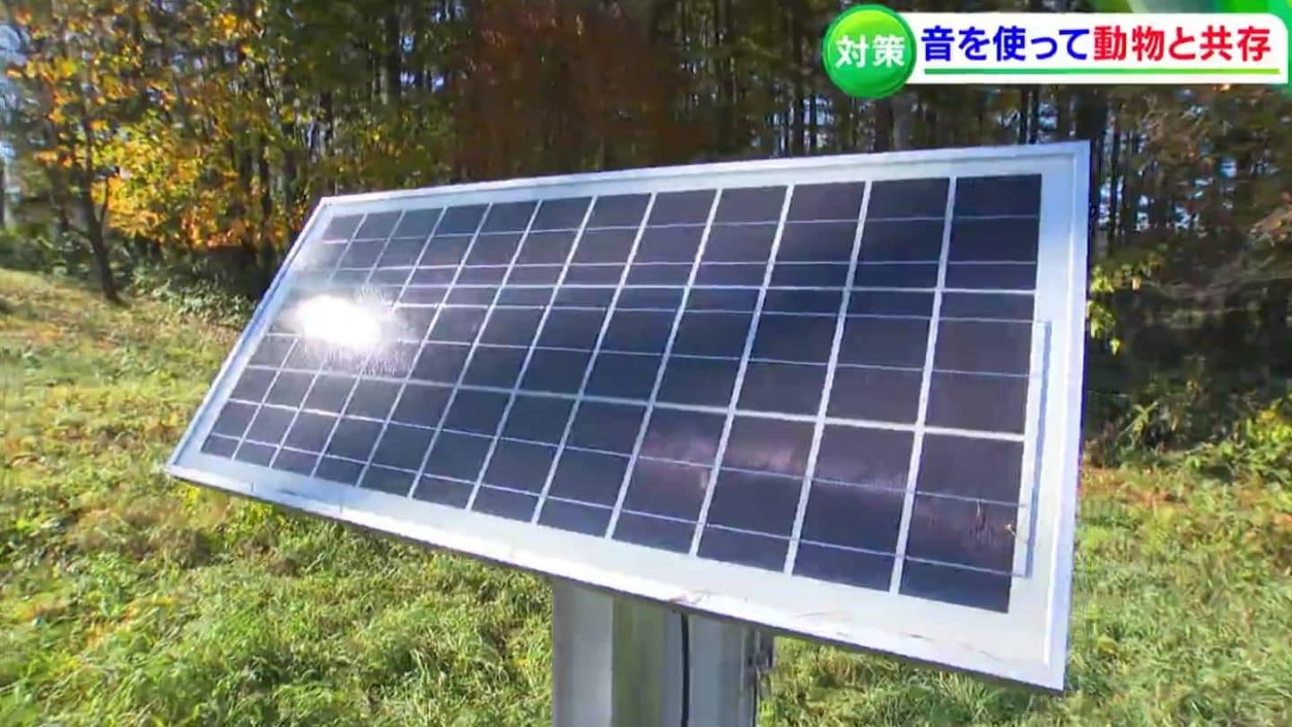 ソーラーパネルとスピーカーなどを組み合わせた装置。クマに悩まされる北海道で、救世主になりうると期待されています。