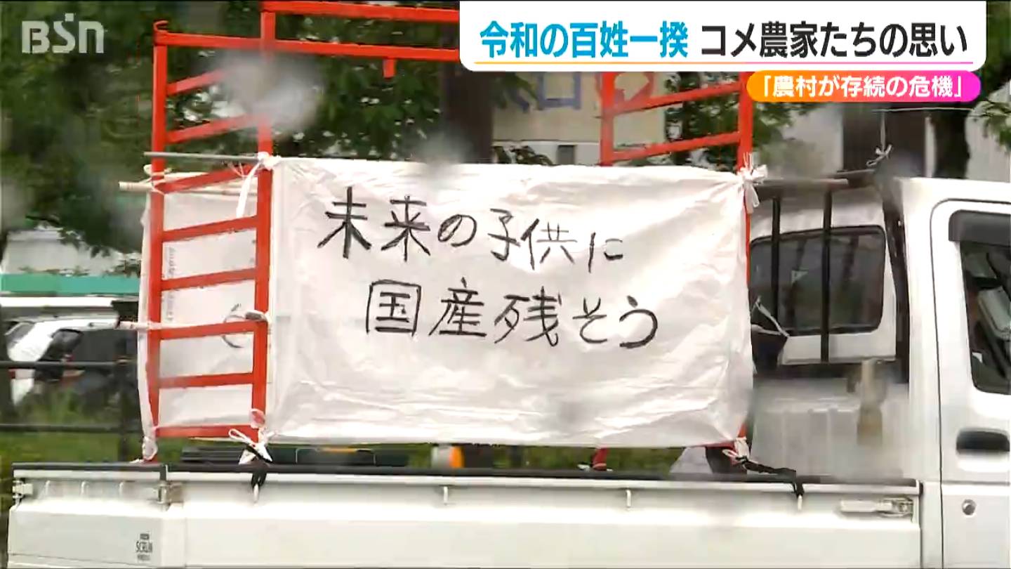 街中を走る数十台のトラクターや軽トラックと共に歩く人々の先頭に掲げられたのは『令和の百姓一揆』と記された横断幕。