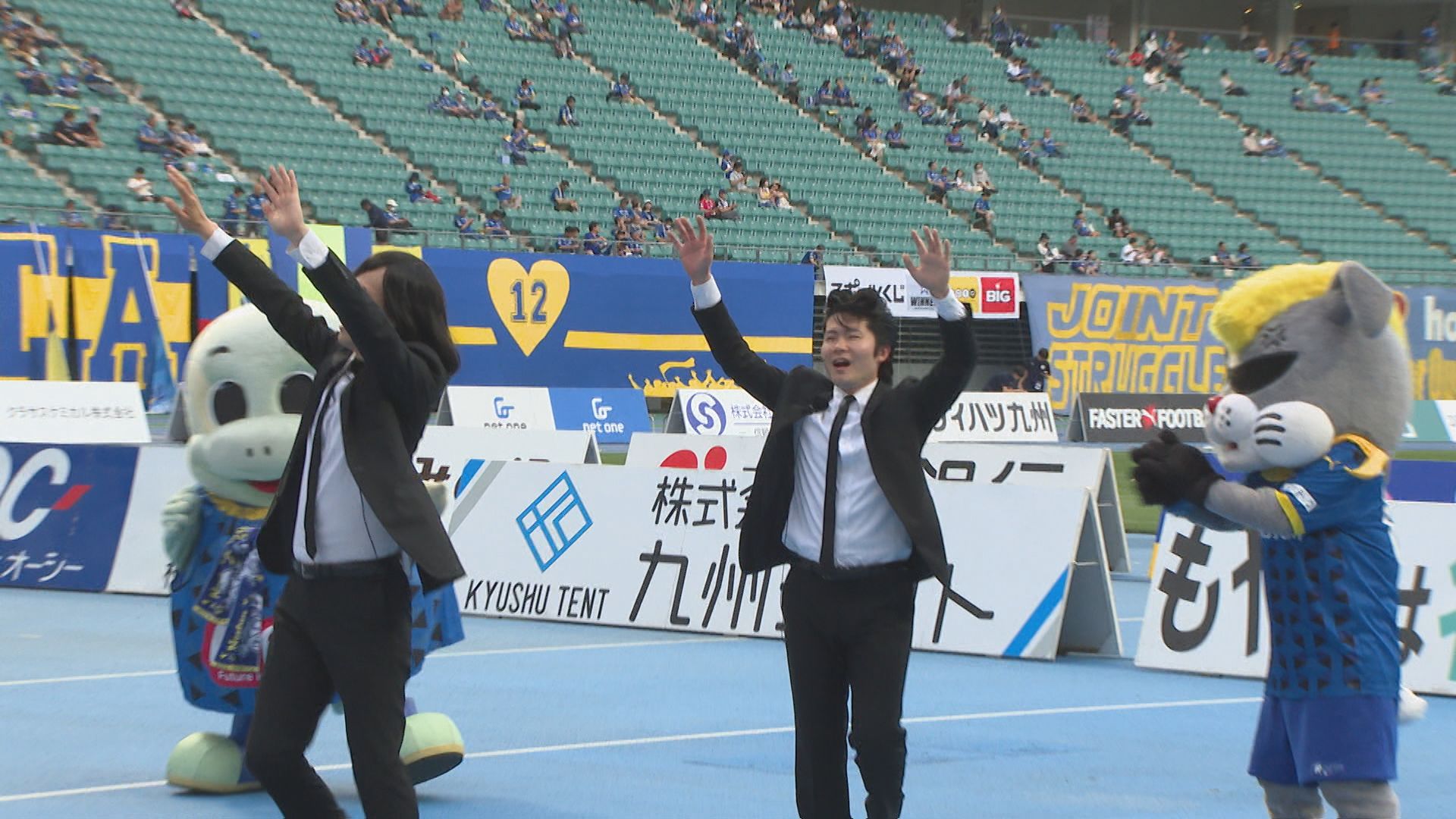 念願だった大分トリニータのピッチに立ったゆうじろーさん。「やっぱ本当に誰でも入ることができるわけじゃないんで、特別な景色でしたね。選手はより歓声を浴びて本当にパワーもらえるって言ってますけど、本当だなと思いましたね」と、プロサッカー選手に近い経験ができたことに目頭を熱くしました。