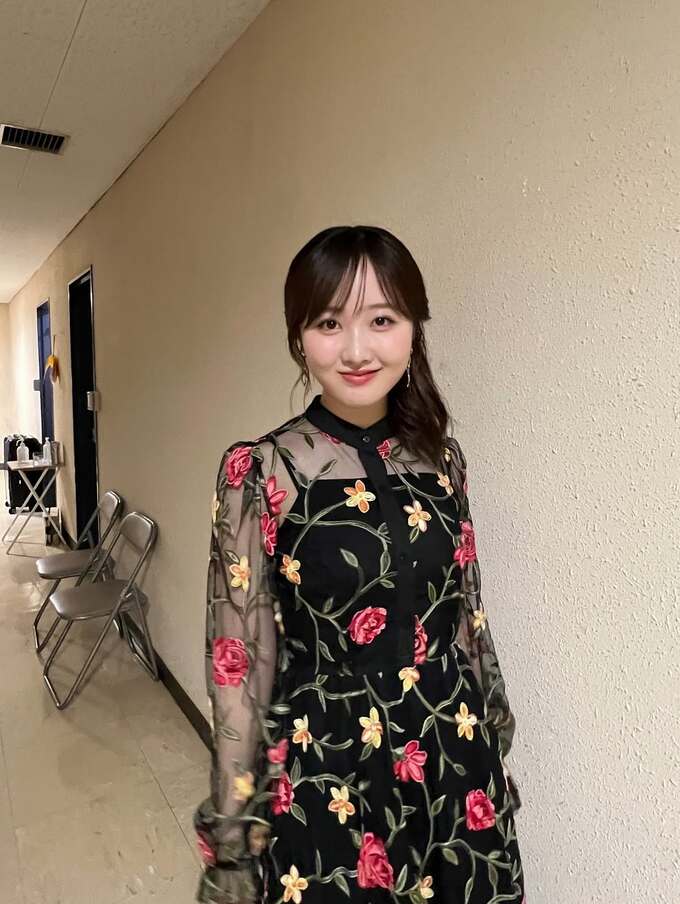 投稿された写真には、本田さんが、黒を基調とした透け感のある色とりどりの花柄の刺繍が施されたドレスを着用し、やわらかな笑顔を見せています。