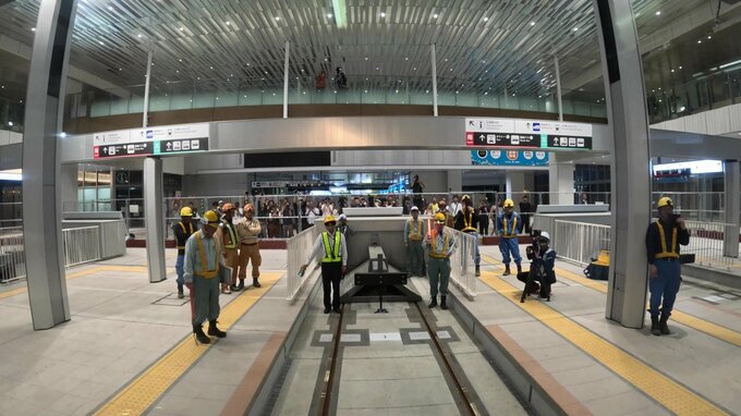 3年前の4月から始まった工事は、5月末には概ね完了。高架部分には、下を通る大州通りの高さを確保するために、まくら木を使わず、レールを樹脂で固定して橋桁の厚みを抑えるなど、様々な技術が用いられています。