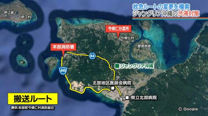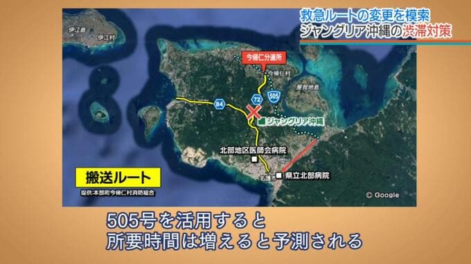 ジャングリア沖縄の開業後は片側1車線の84号線や近隣道路の渋滞が懸念され救急搬送のルート変更を検討しています。