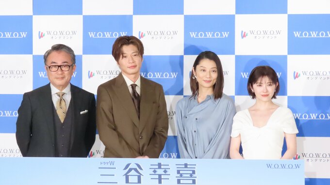 三谷幸喜さん、田中圭さん、小池栄子さん、宮澤エマさんが、ドラマW 三谷幸喜「おい、太宰」完成報告会に登壇しました。作品は、三谷さんの「完全ワンシーンワンカットドラマ」シリーズ12年ぶりの新作となります。