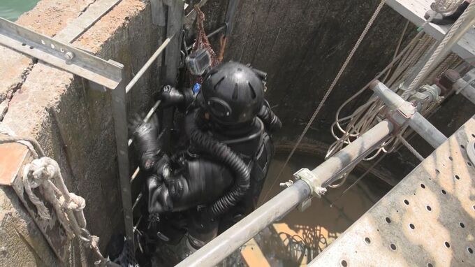 ダイバーの伊左治佳孝さんが沖側の排気筒・ピーヤから旧坑道を100メートルほど進み、坑口からおよそ400メートルの地点に到達しました。