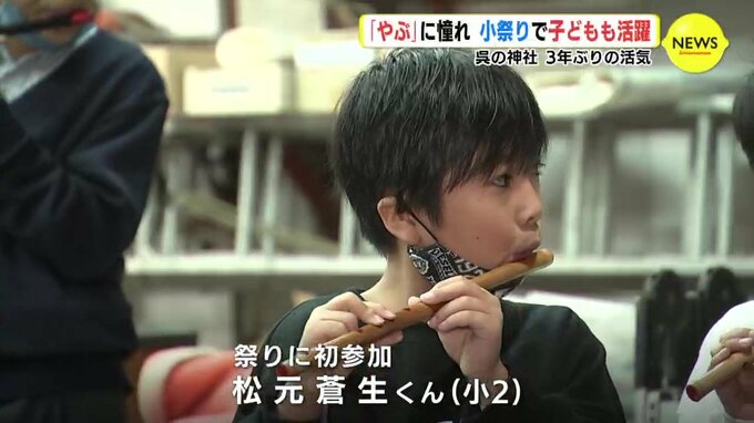 まだまだ、たどたどしい様子で笛を吹いているのは、ことし、初めて祭りに参加する小学2年生の松元蒼生くんです。やぶにあこがれ、参加することにしました。