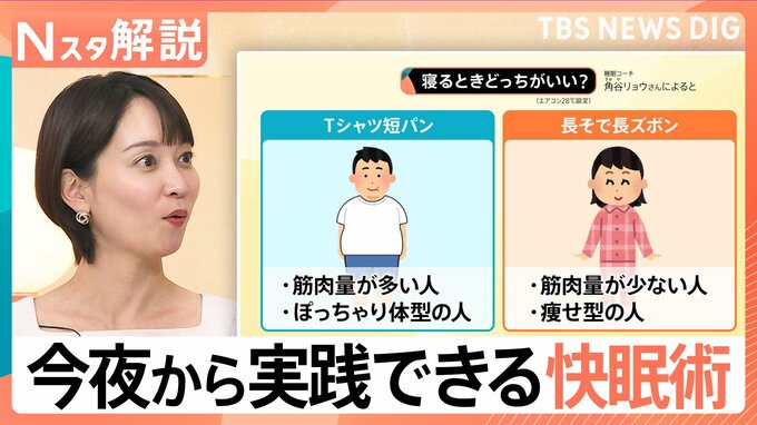 いきなりの猛暑で夜、寝苦しさを感じている人も多いと思います。このコーナーでは、今夜からできる「快眠術」をお伝えします。井上貴博キャスター:今回のイチバンのギモンは「寝るときはTシャツ短パンじゃダメなん…