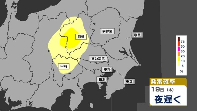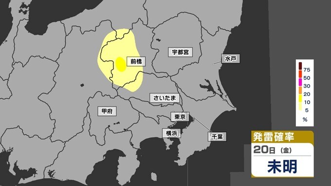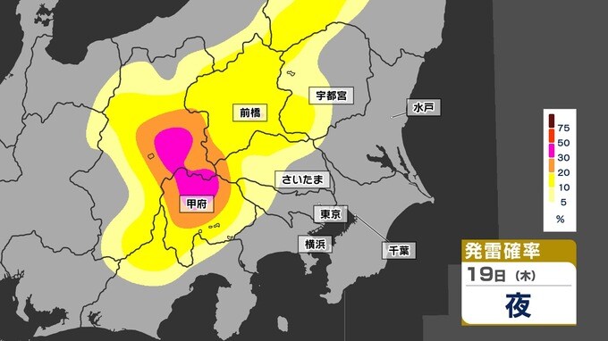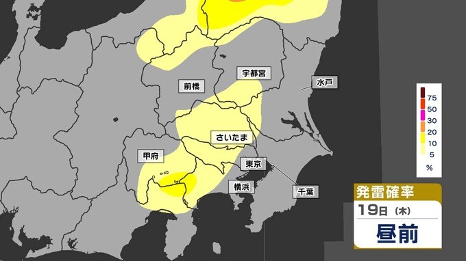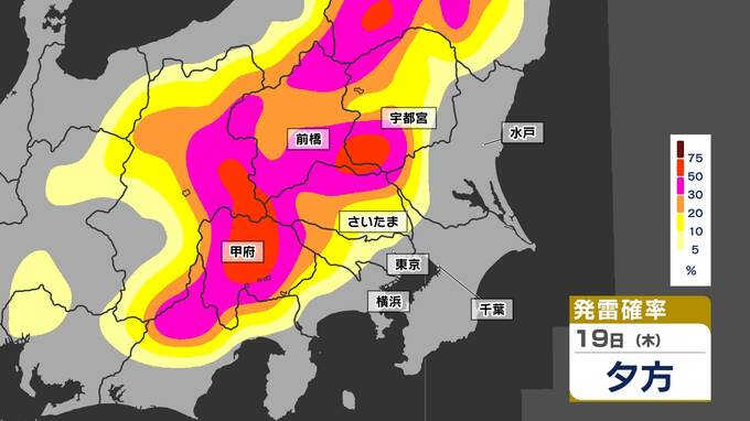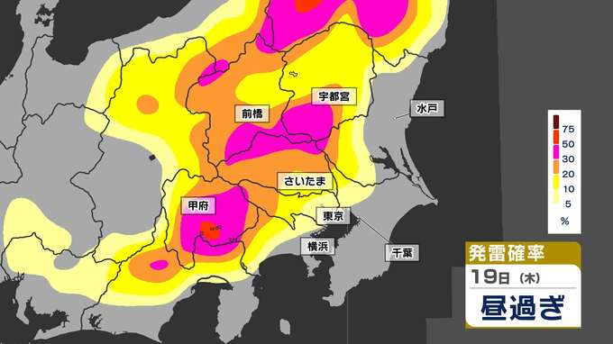 《発雷確率》つまり雷の発生確率は、大気の状態の目安です。確率が高ければ〈大気の状態が不安定〉で、それだけ〈急な強い雨〉や〈雷〉〈突風〉〈ひょう〉などが発生する可能性が高くなります。発雷確率が50%以上のところもあり、大気の状態は非常に不安定です。画像で確認できます。