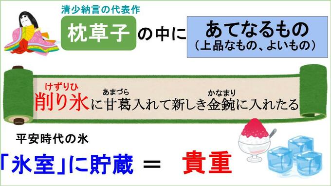 かき氷の歴史は古く、平安時代にはすでに楽しまれていました。清少納言の随筆「枕草子」には「削り氷(けずりひ)」と記されており、その美しさと冷たさが賞賛されています。当時の「削り氷」は冬に貯蔵した天然の氷を夏に削り、甘葛(あまずら)という甘味料などをかけて食されていたといわれています。庶民には手の届かない、非常に貴重なものでした。