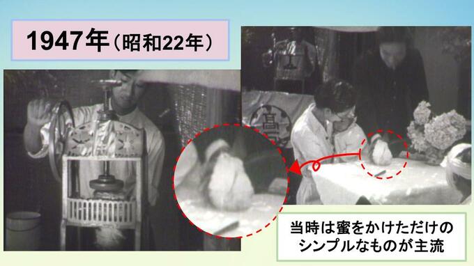 TBSのアーカイブスに残る最も古いかき氷の映像は1947年のものです。当時は削りたての氷に蜜をかけただけのシンプルなかき氷が主流でした。