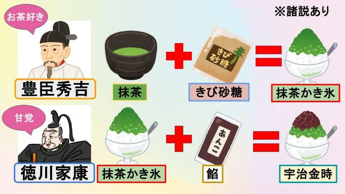 現代の私たちが慣れ親しんでいるかき氷の代表格といえば「宇治金時」ですが、その生みの親は「豊臣秀吉と徳川家康のコンビ」だといわれています。もともとお茶好きの豊臣秀吉が、宇治の抹茶にきび砂糖をかけて、抹茶かき氷を嗜んでいたそうです。その抹茶かき氷に、甘党の徳川家康が餡(あん)を添えて完成させたのが宇治金時と言われています。