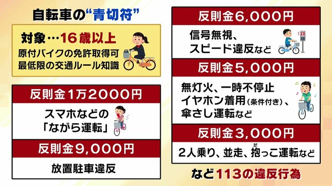 来年4月に導入される自転車の「青切符」制度、まず対象となるのは16歳以上です。これは、原動機付自転車の運転免許を取得できる年齢であり、最低限の交通ルールに関する知識を有しているためと説明されています。主な反則金は、以下のようになっています。