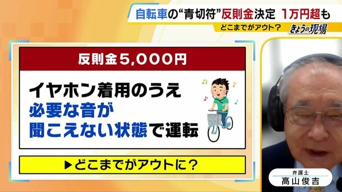 さて、自転車に乗りながらイヤホンを使用する行為は、反則金5,000円の対象となる場合があります。条件付きとされていますがそれは「イヤホン着用のうえ、必要な音が聞こえない状態で運転」していると判断された場合です。ややこしい点があり、高山弁護士に詳しく聞きます。