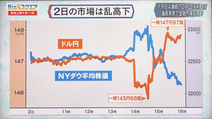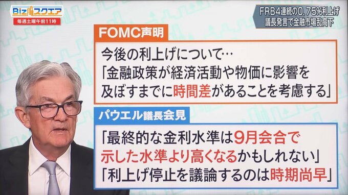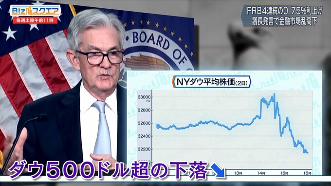 FRB(米連邦準備制度理事会)は11月2日、4回連続で通常の3倍となる0.75%の利上げを決めた。今後の利上げペースをめぐるパウエル議長の発言に金融市場は大きく揺れ、ダウ平均株価は乱高下した。インフレが収まらない中、今後の米国の利上げはどうなるのか。日米の金利差の影響で円安が続く日本への影響は?