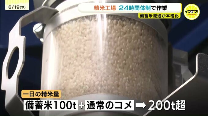 作業は18日から本格化し、搬入されるコメの量は、1日100トンに増えました。通常のコメの精米作業もあるため、こちらでは24時間体制で対応しているといいます。