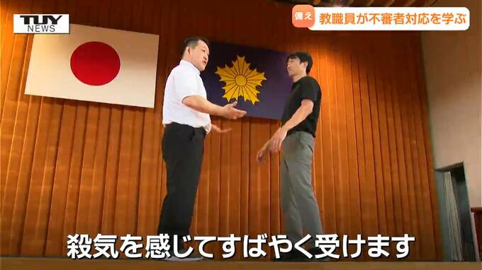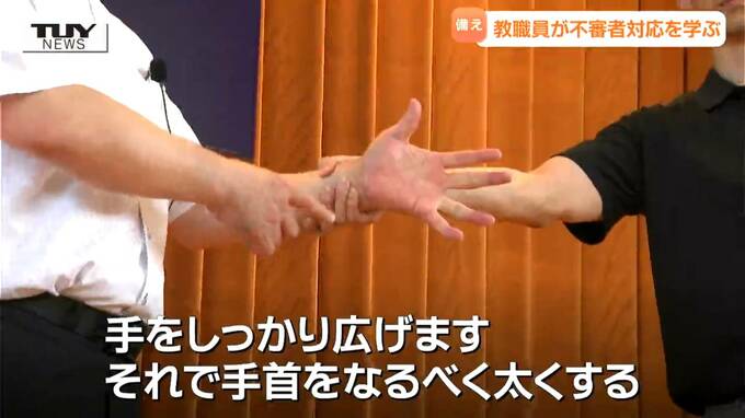 講師役の警察官「(手を掴まれた時の護身術の説明)手をしっかり広げます。それで手首をなるべく太くする。手を抜く方法は、親指とこの四肢の間があるので、そこに親指を向けてあげて、親指の方を自分の方に引っ張る。女性の場合は、反対の手を持っていただいて両手で」