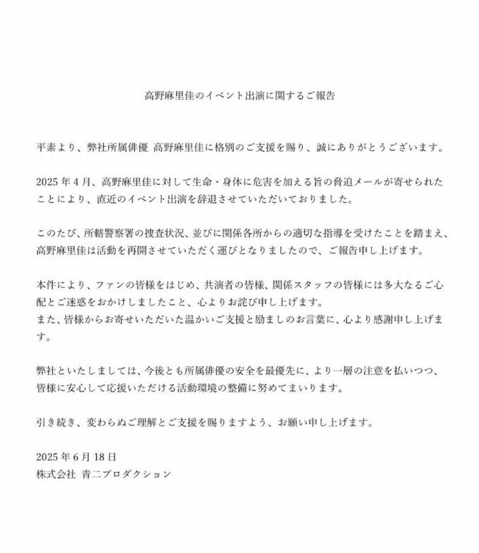 公式X掲載の文章によると「2025年4月、高野麻里佳に対して生命・身体に危害を加える旨の脅迫メールが寄せられたことにより、直近のイベント出演を辞退させていただいておりました。」と、現在までの経緯を説明。