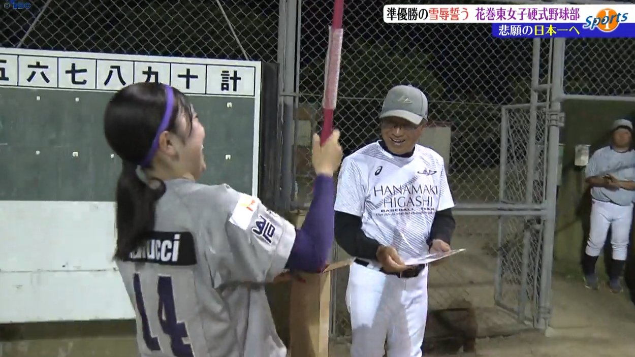 サプライズで沼田監督の誕生日を祝い、ピンクのノックバットをプレゼントです。