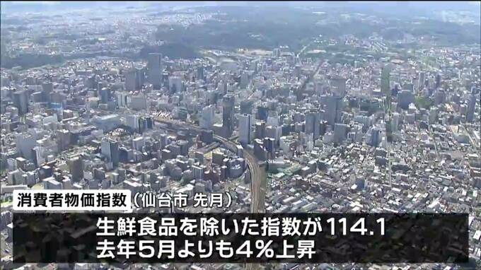 家庭で消費するモノやサービスの値動きを見る消費者物価指数で、5月に仙台市では、生鮮食品を除いた指数が、2024年の同じ時期よりも4%上昇しました。上昇は3年11か月連続です。総務省が、20日に発表した5月の消費…