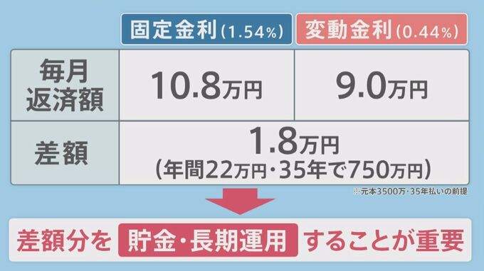 私が考えてるのが貯蓄と運用というところで、例えば元本が3500万円の場合、固定金利と変動金利では毎月の返済額の差額が1.8万円、年間でいうと22万円となります。これをしっかりとまず貯めて、運用に回すということがすごく大事です。変動金利は安いので、その分浪費してもいいというわけではなくて、ちゃんと貯めて運用して、何か起きたときの備えにする。これが非常に大事かなと思います。
