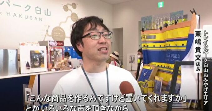 トレインパーク白山おみやげエリア・東嶋貴文店長「現在50くらい商品を取り揃えていて今現在も進行中というところです」
