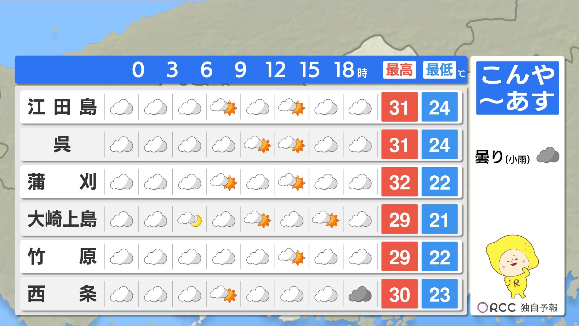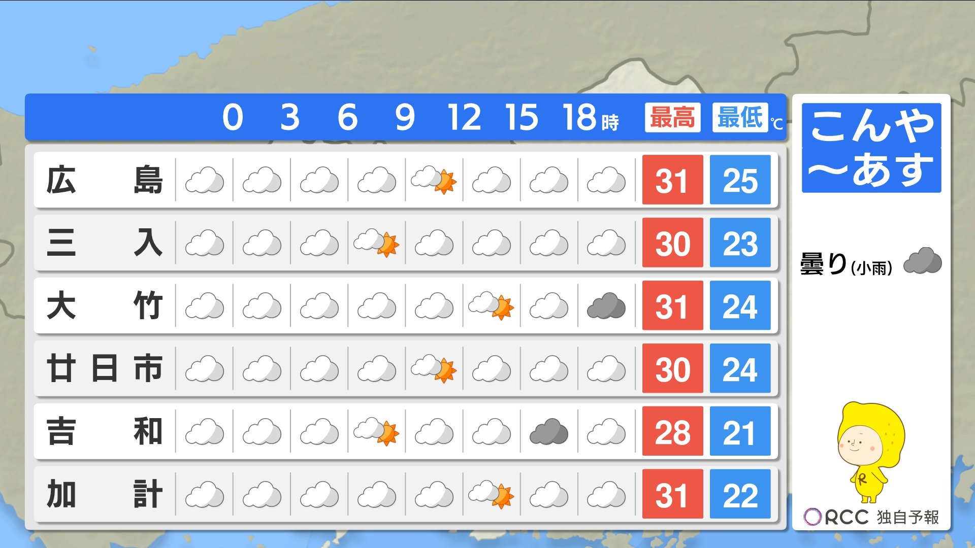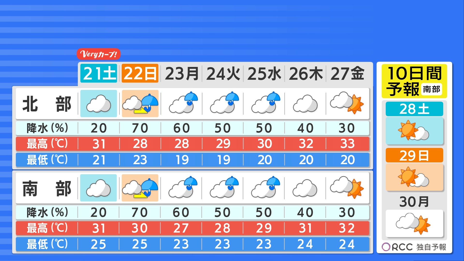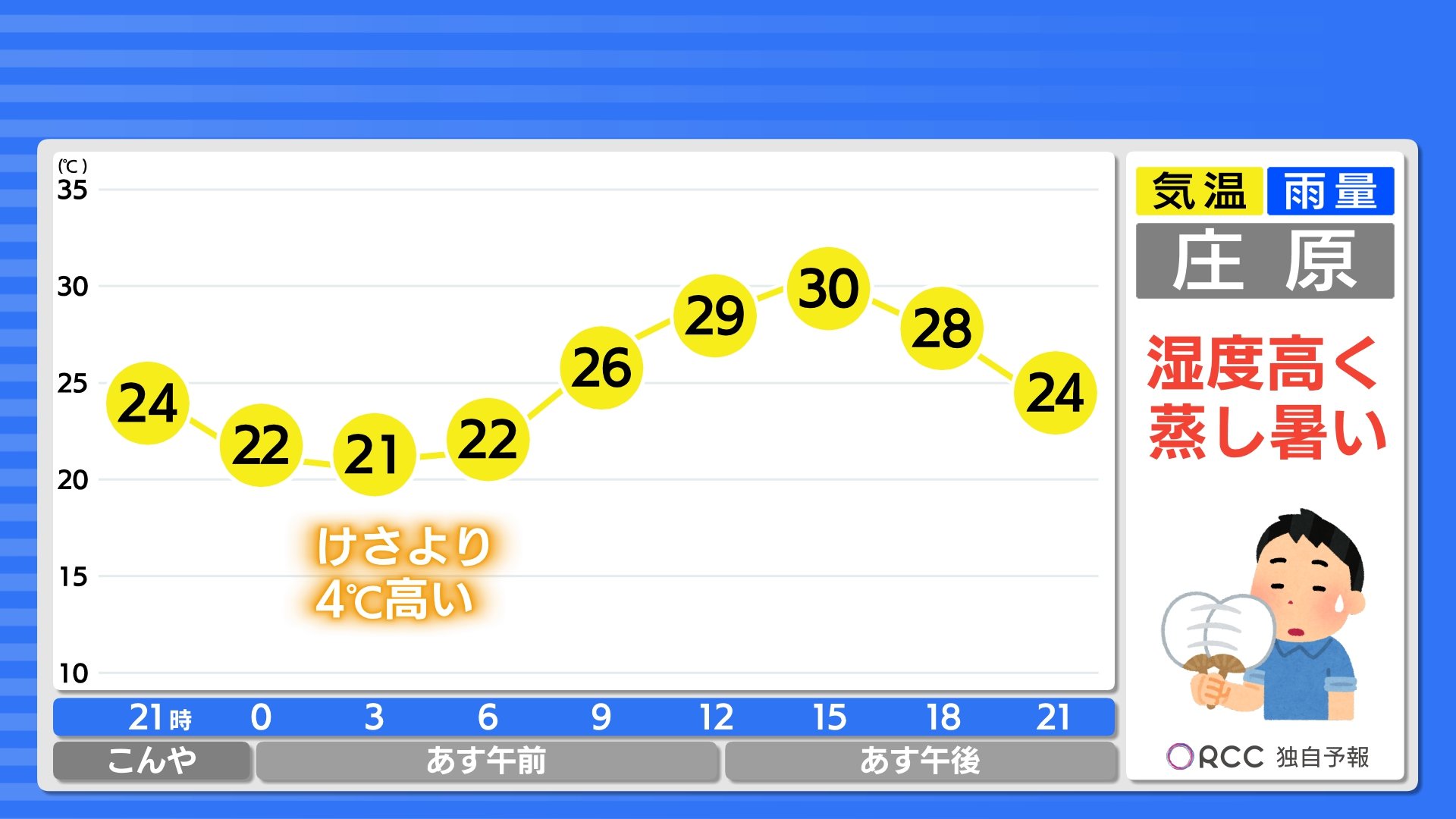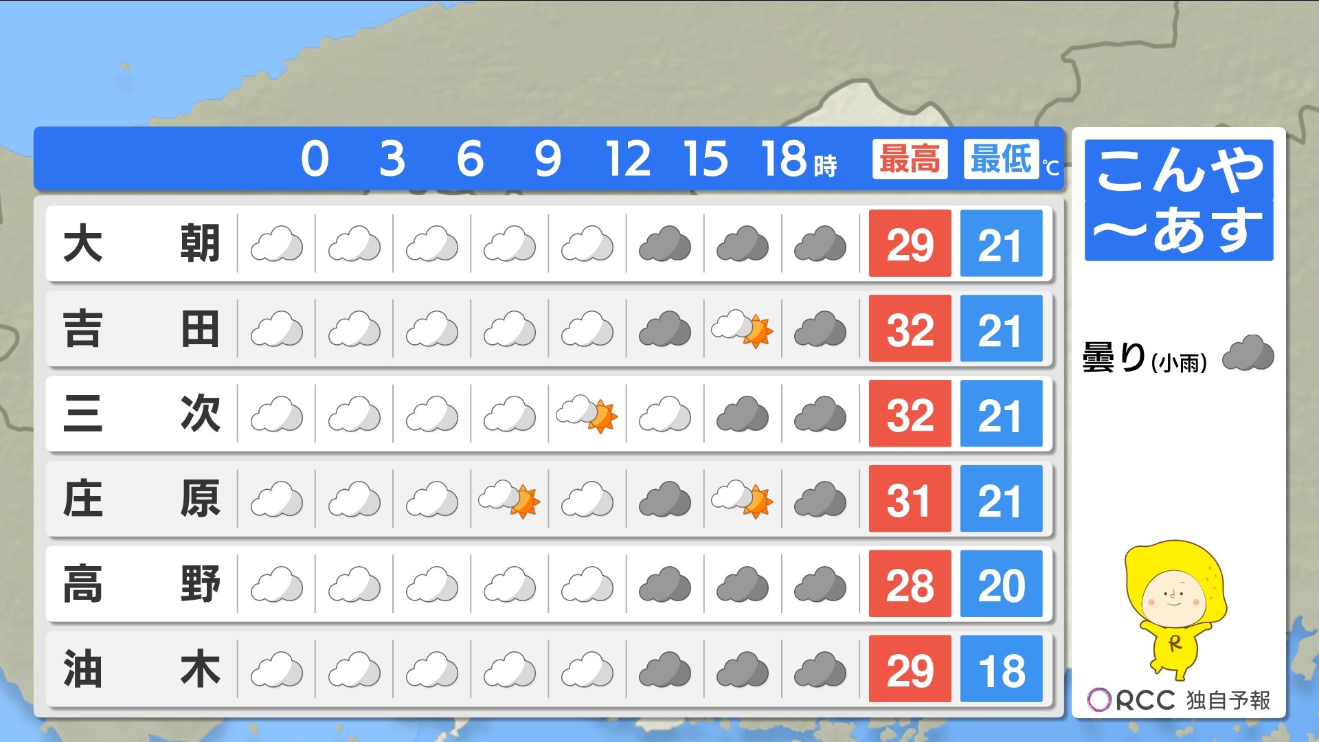 あす21日(土)は、日本海にのびる前線に向かって湿った空気が流れ込み、県内は雲が多い1日となる見込みです。すき間から日差しが届く時間もあるでしょう。夜を中心に、にわか雨の降るところもありますが、大きな崩れではない予想です。朝は、南部で25℃を下回らないところもある見込みで、ことし初めての熱帯夜となる可能性があります。日中の気温は、30℃を超えるところが多く、湿度も高いため、日差しが少なくても蒸し暑いでしょう。