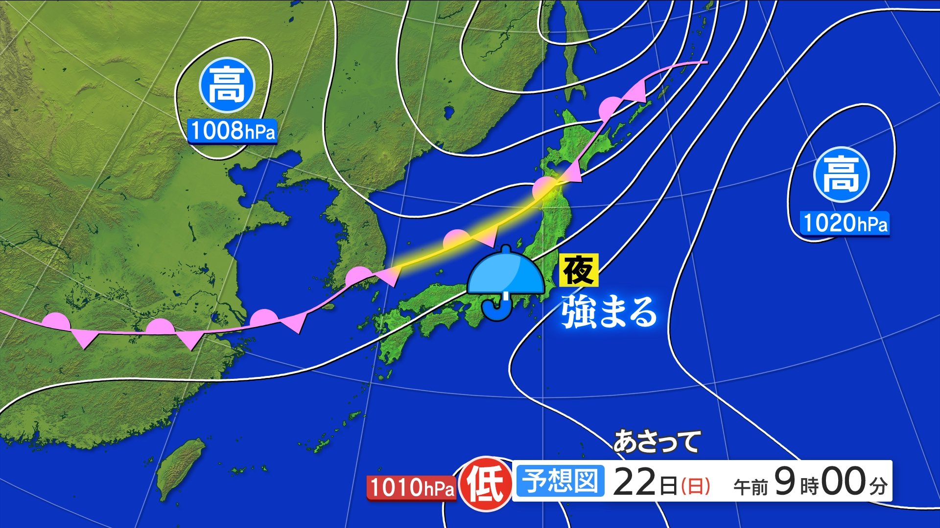 あさって22日(日)は、前線が南下して県内に近付く見込みです。1日どんよりとした空が広がり、午後ほど雨が降りやすいでしょう。雨脚が強まる時間もある見込みです。