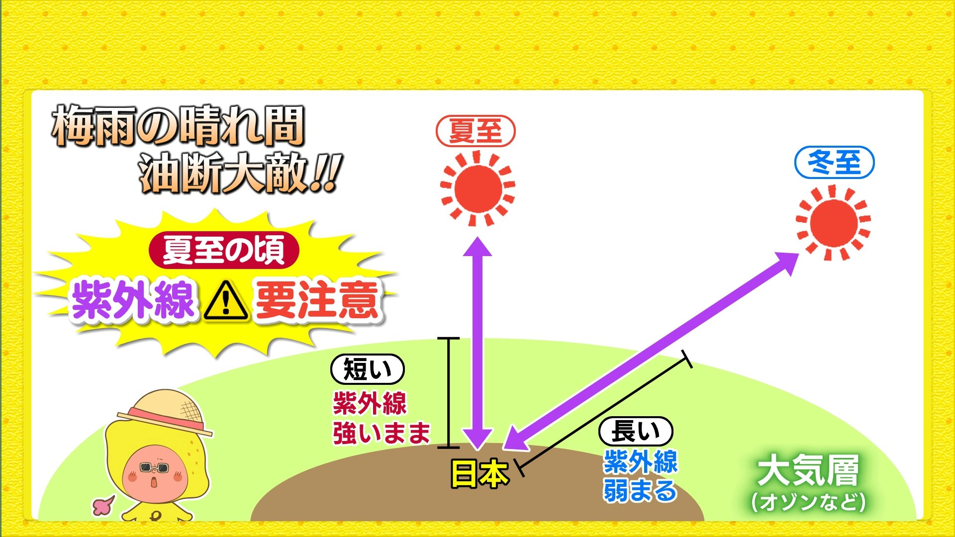 2000年リリースのミニアルバム「ゆずマンの夏」収録曲です。初期のゆずのフォーク色が印象的な曲です。タイトルにあるように、ここ数日は真夏の太陽が照りつけました。実は、今が1年でもっとも日差しが強い時期なのです。あすは夏至。昼が1番長くなる日ですが、ほぼ真上から日が差し、日差しが強くなる時期でもあります。この時期の梅雨の晴れ間は、特に紫外線に注意しなければいけません。