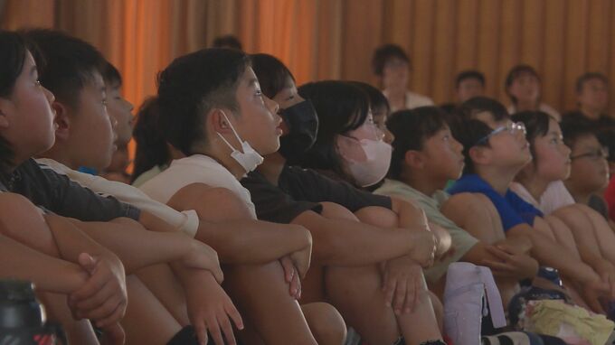 人権教育の一環で宇部市で講演し、小中学生約570人に演奏も披露しました。田川さんの演奏はネックを逆さに持つ独自のスタイルです。