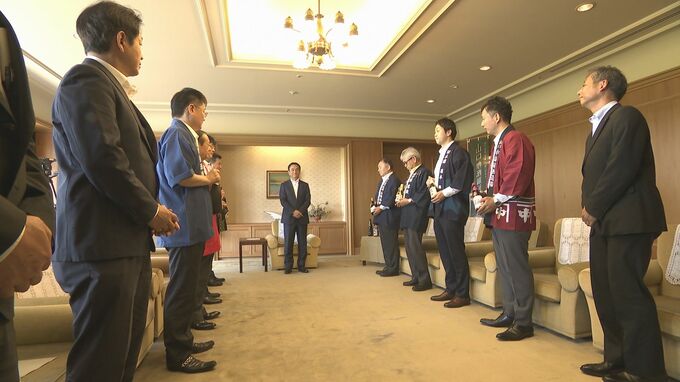 全国新酒鑑評会で、山口県からは過去最多となる8の蔵が金賞を受賞したことを受け、19日、県酒造組合が村岡知事に喜びを報告しました。