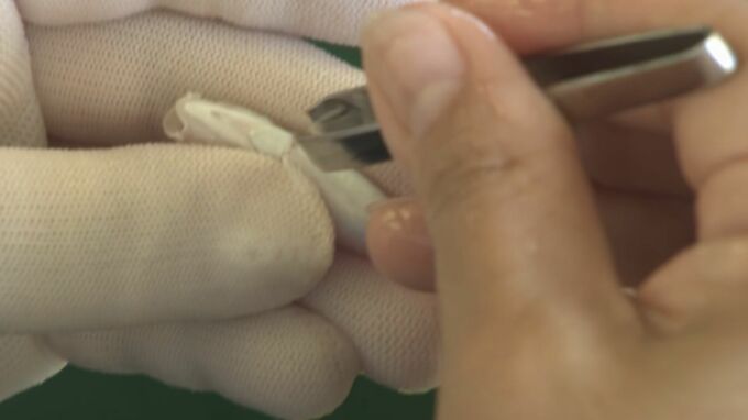 全長50から70ミリの稚魚の左腹にあるヒレをピンセットで丁寧に取り除き、個体の識別ができるよう標識を付けました。