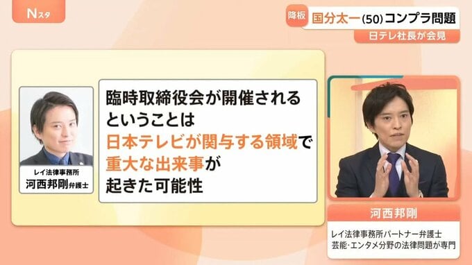二つ目は、日本テレビが関与する領域の中で、重大な出来事が起こったので、取締役会を開き降板について決めていったという経緯だと思われます。