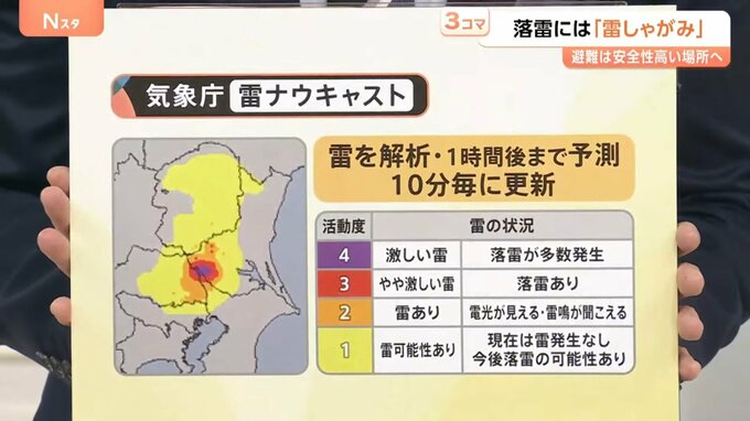 気象庁ではホームページで公開している『雷ナウキャスト』の活用を呼びかけています。雷を解析し、1時間後までの予測を行い、10分毎に更新して情報を提供しています。