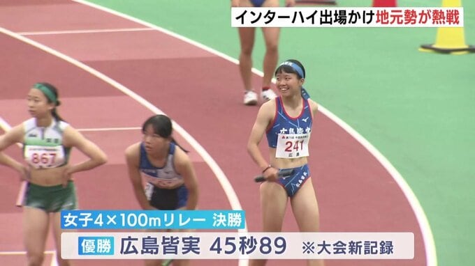広島市で開かれた中国高校総体・陸上。女子4×100メートルリレー決勝では、広島皆実が大会新記録となる45秒89で優勝。