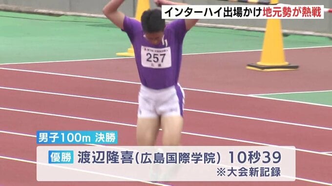 男子100メートル決勝では、第3レーン渡邊隆喜選手が10秒39の大会新記録で優勝し、インターハイの切符を掴みました。