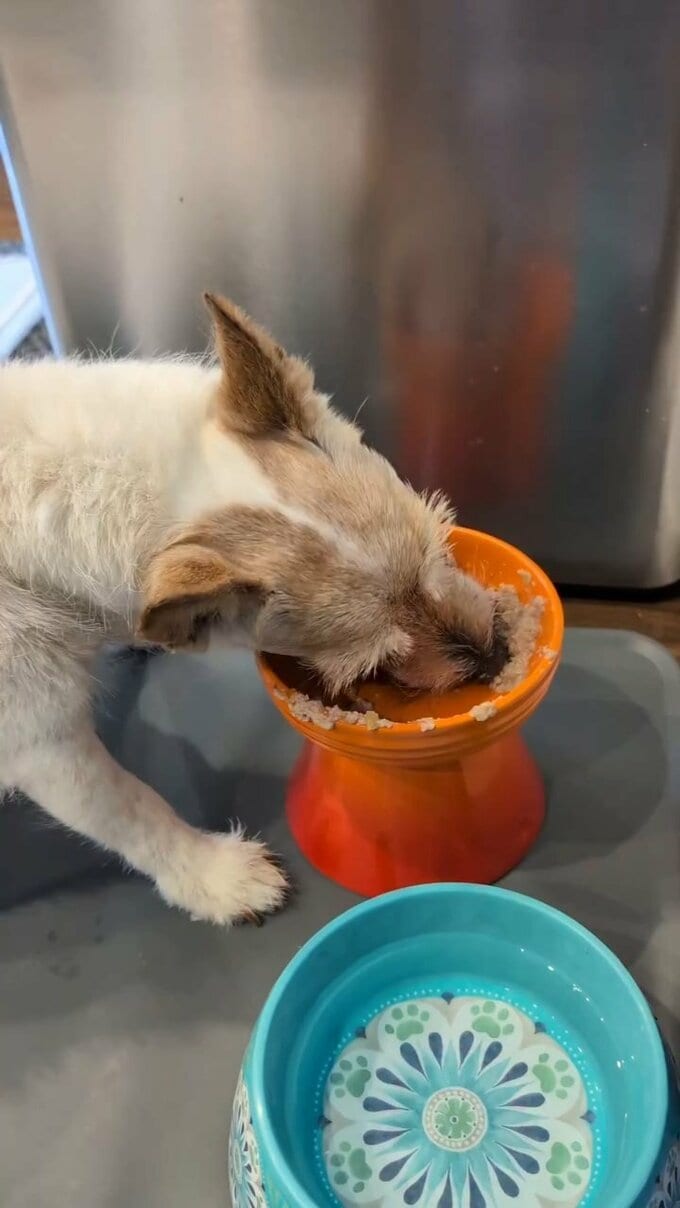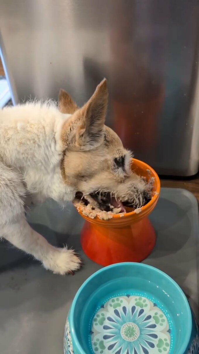 動画では、足つきのお皿に入ったドッグフードを、ヒゲや口周りの毛が汚れようとも気にせずに、テンが大きな口を開けては元気に食いついています。