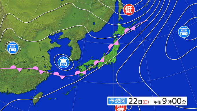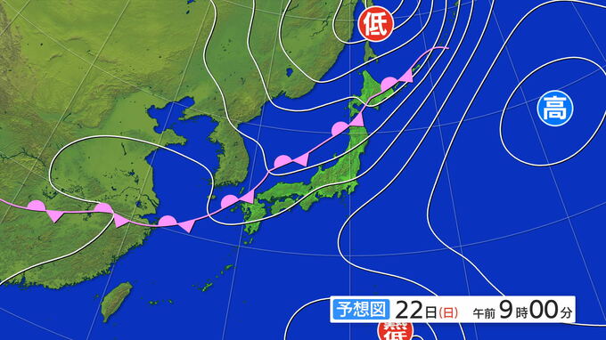 “梅雨前線”が週明けにかけて南下し九州から東北にかかる状態に 23日(月)にかけ西日本から北日本の広い範囲で雨 北陸では大雨のところも 雨と風シミュレーション 北陸放送 2025年6月21日(土) 20:15 国内 前線の影響で、22日(日)は北海道など北日本で雨の降り方が激しくなるところがありそうです。その後、23日(月)にかけては前線が南下し西日本から北日本にかけて広く雨が降る見込みです。北陸では22日の夜から23日にかけて大雨のおそれがあります。 22日(日)午前9時の予想天気図です。大陸から東シナ海、日本海を通って千島付近へと長くのびる前線があります。 22日(日)午前9時の予想天気図 前線がかかる北海道では日本海側を中心に雨の降り方が激しくなりそうです。そして、22日午後9時の予想天気図では前線は南下し九州から東北にかかる見込みです。 22日(日)午後9時の予想天気図 梅雨前線に向かって暖かく湿った空気が流れ込み、その後23日にかけては西日本から北日本の広い範囲で雨が降るでしょう。