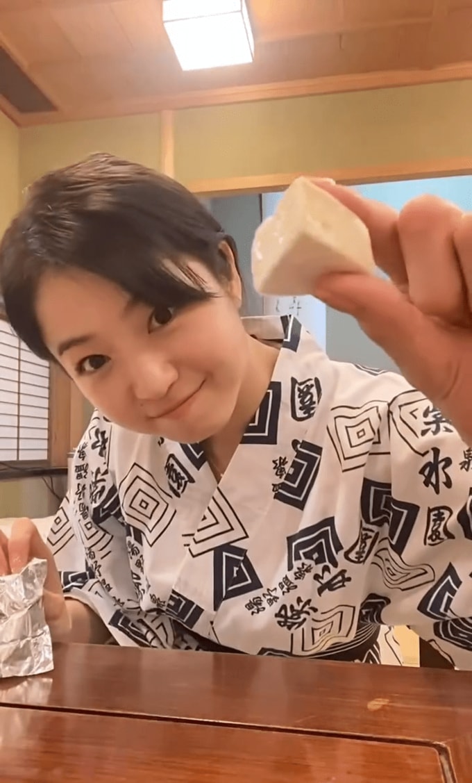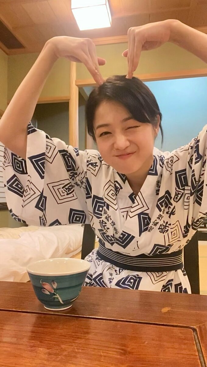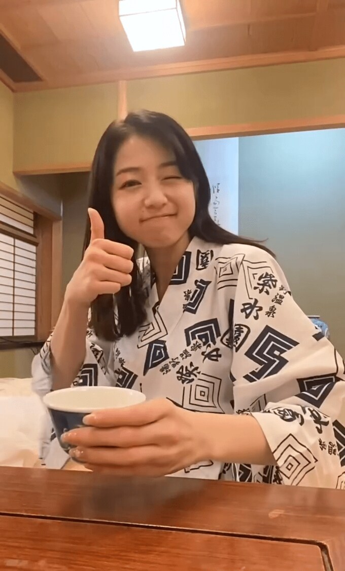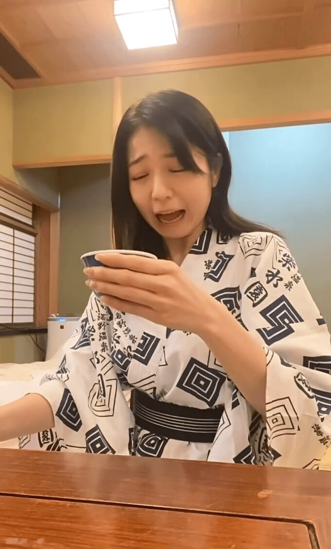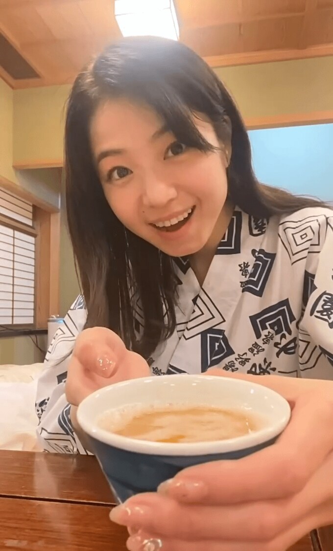 続けて「お部屋にグラスが見当たらなくて 夜遅くに旅館の方にお願いするのも申し訳なく 湯呑みでビールいただきました」と綴ると動画をアップ。