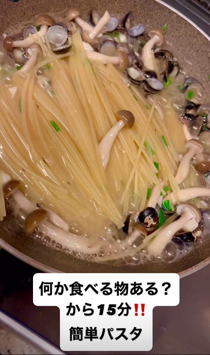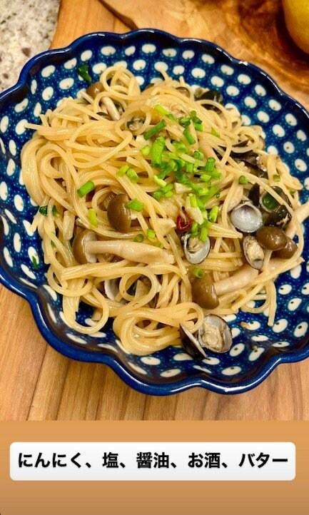 続けて、「にんにく、塩、醤油、お酒、バター」と調味料を紹介し、しじみ、しめじ、ネギなどを使ったパスタが盛り付けられた写真を投稿しました。